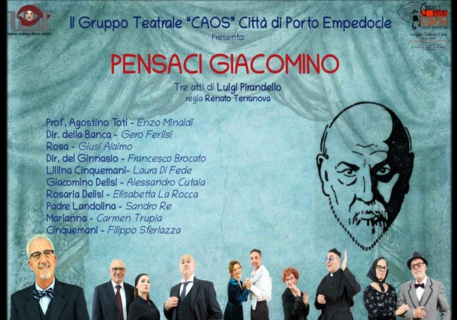 Sabato 14 marzo 2026, alle ore 18:00, nella sala del Teatranimahub, il nuovo centro culturale realizzato dalla Associazione Culturale TeatrAnima all’interno dell’ex Istituto Gioeni/Salesiani di Via Oblati 96, il Gruppo Teatrale Caos – Città di Porto Empedocle – presenterà “Pensaci Giacomino”, i tre atti di Luigi Pirandello, con la regia di Renato Terranova. In scena: Enzo Minaldi, Gero Ferlisi, Giusi Alaimo, Francesco Brocato, Laura Di Fede, Alessandro Cutaia, Elisabetta La Rocca, Sandro RE, Carmen Trupia, Filippo Sferlazza.