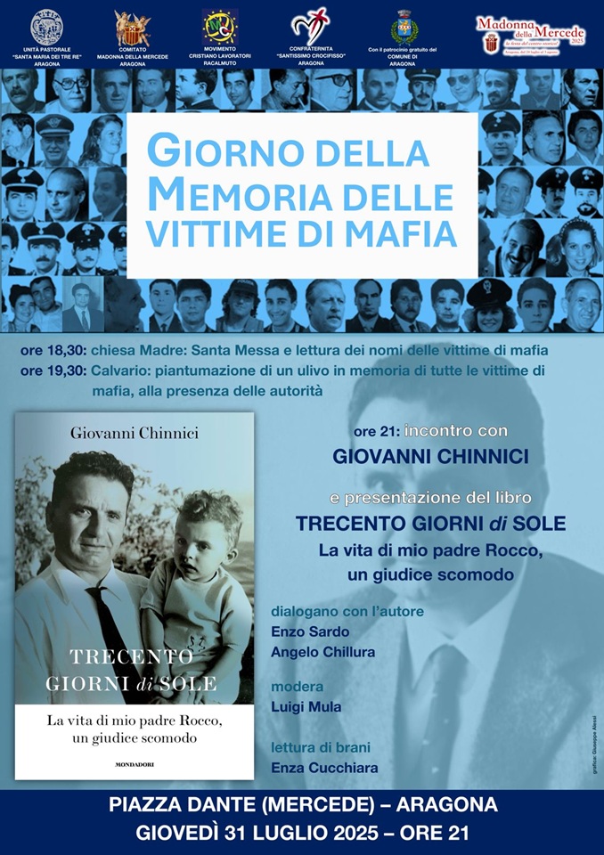 Aragona fa memoria del giudice Rocco Chinnici nel 42.mo anniversario della sua uccisione con la testimonianza del figlio Giovanni, autore del libro “TRECENTO GIORNI DI SOLE. La vita di mio padre Rocco, un giudice scomodo”, giovedì 31 luglio alle ore 21 in piazza Dante (Mercede) ad Aragona, nel Giorno della Memoria delle Vittime di Mafia. Per l’occasione, infatti, alle 18:30, in Chiesa Madre si celebrerà la Santa Messa e la lettura dei nomi delle vittime innocenti di mafia, alle 19:30, al Calvario, si piantumerà un ulivo in memoria delle vittime innocenti di mafia, alla presenza delle autorità.