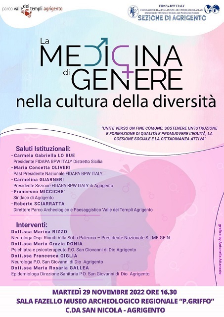La medicina di genere nella cultura della diversità” è il titolo dell’incontro organizzato dalla Fidapa Bpw-Italy di Agrigento, in programma martedì 29 novembre, alle 16,30 alla Sala Fazello del Museo Archeologico Regionale Pietro Griffo di Agrigento.