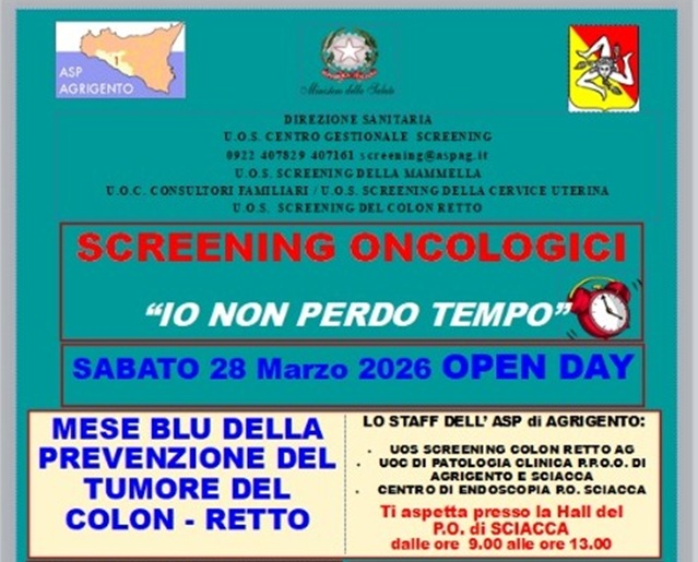 In occasione del “Mese Blu della prevenzione del tumore del colon-retto”, l’Azienda Sanitaria Provinciale di Agrigento, promuove una giornata dedicata alla prevenzione oncologica, con un Open Day in programma sabato 28 marzo 2026 presso l’Ospedale di Sciacca.